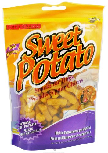 Up to 15% Off Natural & Organic Treats - Beefeaters Sweet Potato Bones Getting tired of the same old biscuit? Put a little variety in your dog's diet. Beefeaters Sweet Potato Bones are meatless and full of vitamins. Grab one of these low-fat bites whenever your buddy's got a hankering for a snack. Features: · Sweet potato is a terrific change of pace from the "same old, same old" snacks · Lower in fat and higher in fiber than traditional treats · Makes a great reward for good behavior or a healthy between-meal treat Item Specifications: Size: 6 oz re-sealable bag Treat Dimensions: 2"L (approx.) Ingredients: Sweet Potato, Palm Oil, Dextrose, Citric Acid, Sodium Metabisulfite Guaranteed Analysis: Crude Protein (minimum) 1.59%, Crude Fat (minimum) 1.39%, Crude Fiber (maximum) 2.1%, Moisture (maximum) 19.67%w